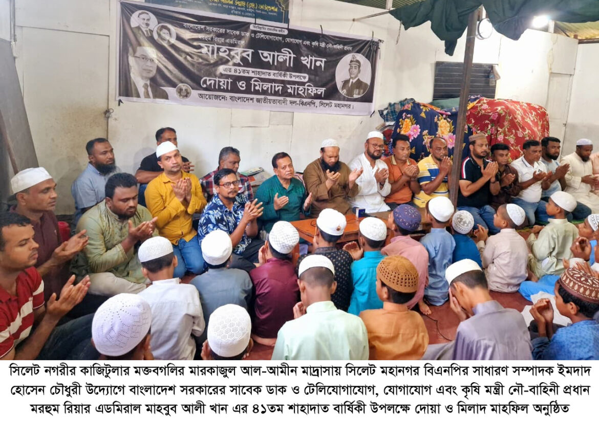 সিলেট নগরীর কাজিটুলার মক্তবগলির মারকাজুল আল-আমীন মাদ্রাসায় সিলেট মহানগর বিএনপির সাধারণ সম্পাদক ইমদাদ হোসেন চৌধুরী উদ্যোগে বাংলাদেশ সরকারের সাবেক ডাক ও টেলিযোগাযোগ, যোগাযোগ এবং কৃষি মন্ত্রী নৌ-বাহিনী প্রধান মরহুম রিয়ার এডমিরাল মাহবুব আলী খান এর ৪১তম শাহাদাত বার্ষিকী উপলক্ষে দোয়া ও মিলাদ মাহফিল অনুষ্ঠিত