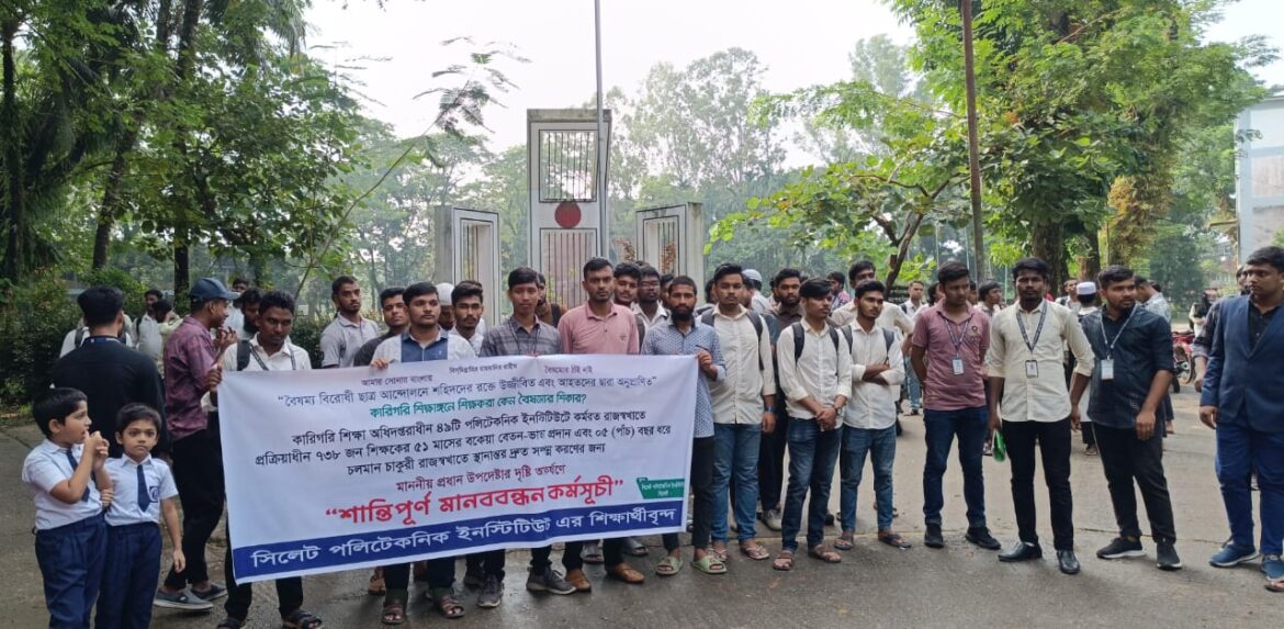 শিক্ষকদের এই ন্যায্য দাবি আদায়ের লক্ষে আজ ৩০শে অক্টোবর সিলেট পলিটেকনিক ক্যাম্পাসে আয়োজন করা হয় মানববন্ধনের। কারিগরি শিক্ষা অধিদপ্তরাধীন ৪৯ টি পলিটেকনিক ইনস্টিটিউটে নিজস্ব খাতে প্রক্রিয়াধীন ৭৩৮ জন শিক্ষকের ৫১ মাসের বকেয়া বেতন ভাতা প্রদান ও পাঁচ বছর ধরে চলমান চাকরি রাজস্ব খাতে সম্পন্ন করনের জন্য মূলত এই মানববন্ধন করা হয়েছে। বিগত দিনে তারা জেলা প্রশাসক বরাবর স্মারকলিপি দেওয়ার পরও কোন ধরনের সুরাহা পান নি বলে মানববন্ধনে থেকে অভিযোগ করা হয়। পলিটেকনিকের শিক্ষার্থীরা বলেন অতি দ্রততম সময়ের মধ্যে যদি কোন ধরনের সমাধান করা না হয় তাহলে তারা কঠোর থেকে কঠোরতম আন্দোলনে যাবেন। শিক্ষকরা বলেন, পাঁচ বছর থেকে তারা কোন ধরনের বেতন ভাতা পাচ্ছেন না যার ফলে হিমশিম খেতে হচ্ছে তাদের পরিবার চালাতে। তারা খুব দ্রুত এটি সমাধান করার জন্য সরকারের উপদেষ্টা মন্ডলীর দৃষ্টি আকর্ষণ করেন।