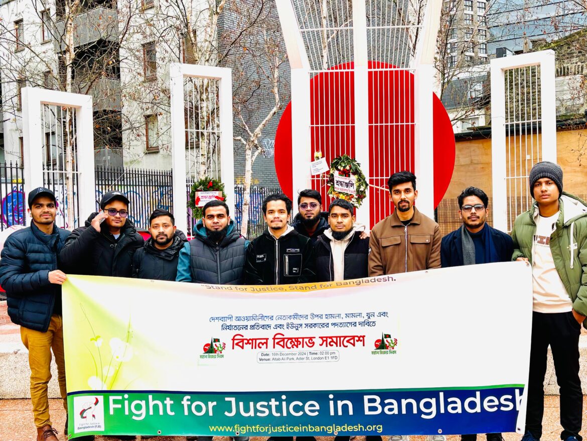 দেশব্যাপী আওয়ামী লীগের নেতাকর্মীদের উপর হামলা, মামলা, খুন এবং নির্যাতনের প্রতিবাদে ও ইউনুস সরকারের পদত্যাগের দাবীতে লন্ডনে প্রতিবাদ সমাবেশ অনুষ্ঠিত হয়েছে। সোমবার (১৬ ডিসেম্বর) লন্ডনের ঐতিহাসিক আলতাব আলী পার্কে অনুষ্ঠিত প্রতিবাদ সমাবেশটির আয়োজন করে যুক্তরাজ্যভিত্তিক মানবাধিকার সংগঠন ‘ফাইট ফর জাষ্টিস ইন বাংলাদেশ’।