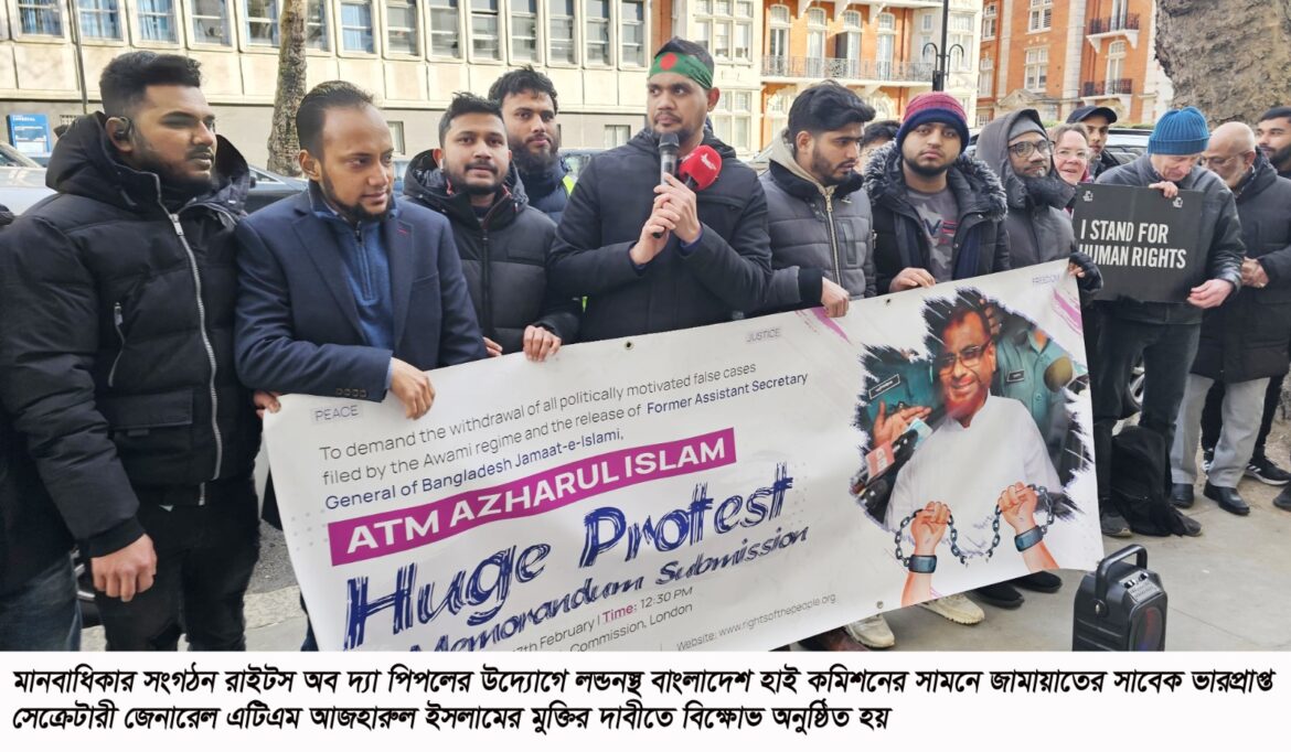 বাংলাদেশ জামায়াতে ইসলামীর সাবেক ভারপ্রাপ্ত সেক্রেটারী জেনারেল এটিএম আজহারুল ইসলামের মুক্তি ও ফ্যাসিস্ট আওয়ামী আমলে দায়েরকৃত সকল রাজনৈতিক মিথ্যা মামলা প্রত্যাহারের দাবিতে লন্ডনে বিক্ষোভ কর্মসূচী পালিত হয়েছে। সোমবার স্থানীয় সময় বিকেলে যুক্তরাজ্যভিত্তিক মানবাধিকার সংগঠন রাইটস অব দ্যা পিপলের উদ্যোগে লন্ডনে অবস্থিত বাংলাদেশ হাইকমিশনের সামনে প্রবাসী বাংলাদেশীরা মানববন্ধন কর্মসূচী পালন ও স্মারকলিপি প্রধান করেন।