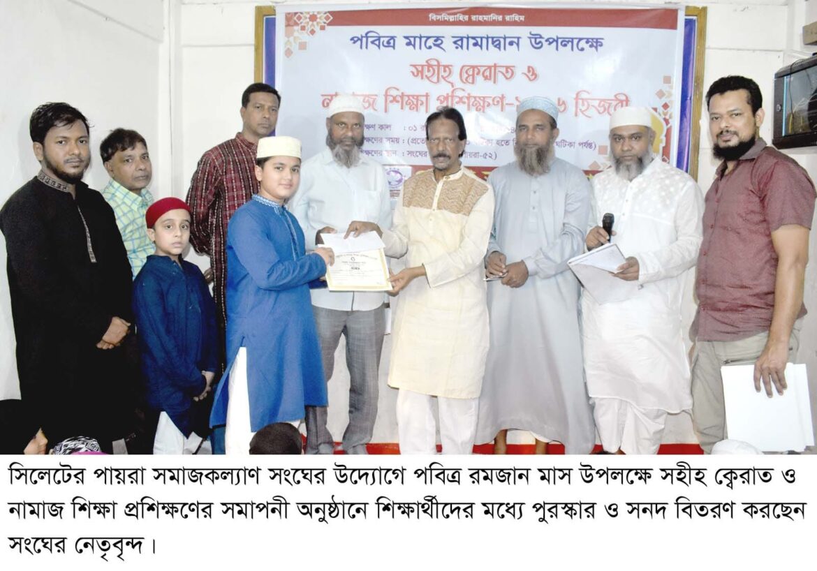 সিলেট নগরীর দরগা মহল্লাস্থ পায়রা সমাজকল্যাণ সংঘের উদ্যোগে পবিত্র মাহে রমজান উপলক্ষে মাসব্যাপী সহীহ ক্বেরাত ও নামাজ শিক্ষা প্রশিক্ষণের সমাপনী, পুরস্কার ও সনদ বিতরণ অনুষ্ঠান সম্পন্ন হয়েছে।