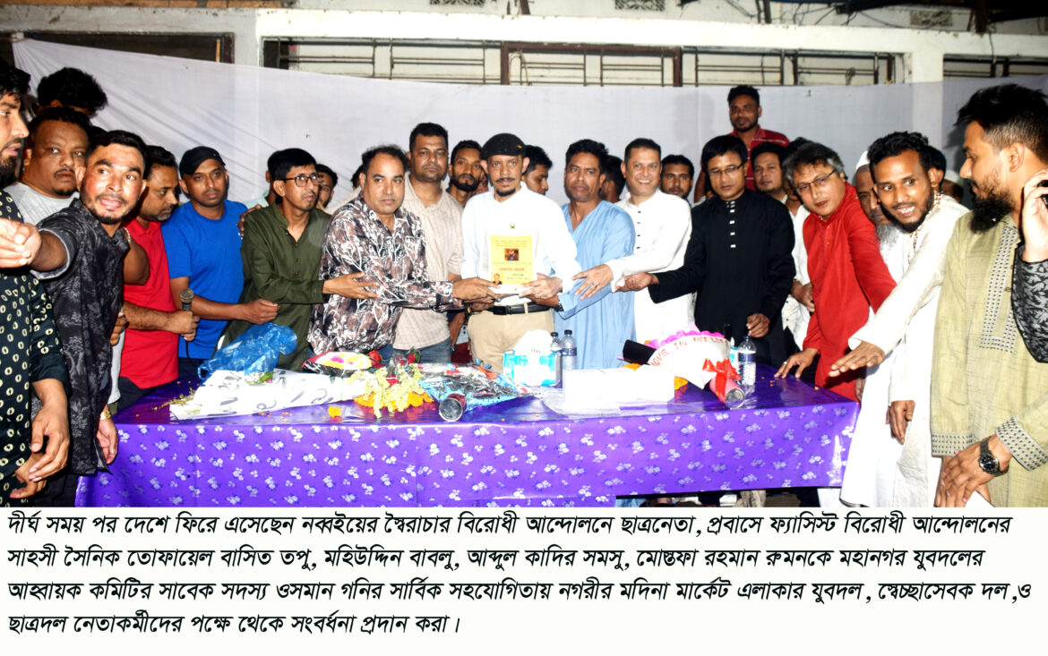 দীর্ঘ সময় পর দেশে ফিরে এসেছেন নব্বইয়ের স্বৈরাচার বিরোধী আন্দোলনে ছাত্রনেতা, প্রবাসে ফ্যাসিস্ট বিরোধী আন্দোলনের সাহসী সৈনিক তোফায়েল বাসিত তপু, মহিউদ্দিন বাবলু , আব্দুল কাদির সমসু , মোস্তফা রহমান রুমনকে মহানগর যুবদলের আহ্বায়ক কমিটির সাবেক সদস্য ওসমান গনির সার্বিক সহযোগিতায় নগরীর মদিনা মার্কেট এলাকার যুবদল, স্বেচ্ছাসেবক দল, ও ছাত্রদল নেতাকর্মীদের পক্ষে থেকে সংবর্ধনা প্রদান করা হয়েছে। গত (১৯ এপ্রিল) রাতে নগরীর মদিনা মার্কেট এলাকার পৌঁছালে সিলেট জেলা ও মহানগর বিএনপি, যুবদল, ছাত্রদল, স্বেচ্ছাসেবক দলসহ সর্বস্থরের নেতাকর্মী সংবর্ধনা প্রদান করেন। এসময় তাদের অভ্যর্থনায় উচ্ছ্বাস ছড়িয়ে পড়েছে মদিনা মার্কেট এলাকার যুবদল, স্বেচ্ছাসেবক দল, ও ছাত্রদল নেতাকর্মীদের মধ্যে। মহানগর যুবদলের আহ্বায়ক কমিটির সাবেক সদস্য ওসমান গনির সার্বিক সহযোগিতায় ৮ নং ওয়ার্ড যুবদলের আহবায়ক আজাদুর রহমান আজাদের সভাপতিত্বে যুব নেতা শাহিন আহমদ ও আব্দুল আজিজ এর যৌথ পরিচালনায়,
