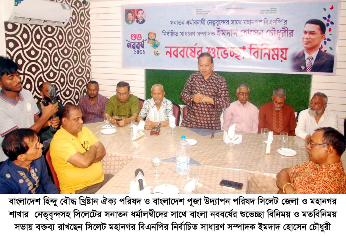 বাংলাদেশ হিন্দু বৌদ্ধ খ্রিষ্টান ঐক্য পরিষদ ও বাংলাদেশ পূজা উদ্যাপন পরিষদ সিলেট জেলা ও মহানগর শাখার নেতৃবৃন্দসহ সিলেটের সনাতন ধর্মালম্বীদের সাথে বাংলা নববর্ষের শুভেচ্ছা বিনিময় ও মতবিনিময় সভা করেছেন সিলেট মহানগর বিএনপির নির্বাচিত সাধারণ সম্পাদক ইমদাদ হোসেন চৌধুরী। শনিবার (১৯ এপ্রিল) রাতে নগরীর বারুতখানাস্থ একটি অভিজাত হোটেলের সম্মেলনক এই সৌজন্য সাক্ষাৎ ও মতবিনিময় সভা অনুষ্ঠিত হয়।