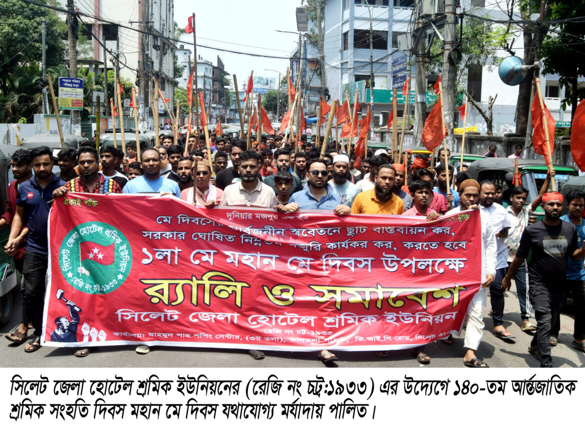 সিলেট জেলা হোটেল শ্রমিক ইউনিয়নের (রেজি নং চট্র:১৯৩৩) এর উদ্যেগে ১৪০-তম আর্ন্তজাতিক শ্রমিক সংহতি দিবস মহান মে দিবস যথাযোগ্য মর্যাদায় পালিত। আজ বৃহস্পতিবার (১ মে) সকালে ১০ টায় তালতরাস্থ সিলেট জেলা হোটেল শ্রমিক ইউনিয়নের কার্যলয়ে তালতলা পয়েন্ট থেকে লাল পতাকা বর্ণাঢ্য র্যালী শুরু হয়ে নগরীর বিভিন্ন সড়ক প্রদক্ষিণ শেষে সিলেট কেন্দ্রীয় শহীদ মিনারে সামনে গিয়ে এক সংক্ষিপ্ত সমাবেশ অনুষ্ঠিত হয়। সমাবেশে সিলেট জেলা হোটেল শ্রমিক ইউনিয়নের ভারপ্রপ্ত সভাপতি ইউসুফ জামিল এর সভাপতিত্বে ও সাধারণ সম্পাদক এম সফর আলী খাঁন এর পরিচালনায়,