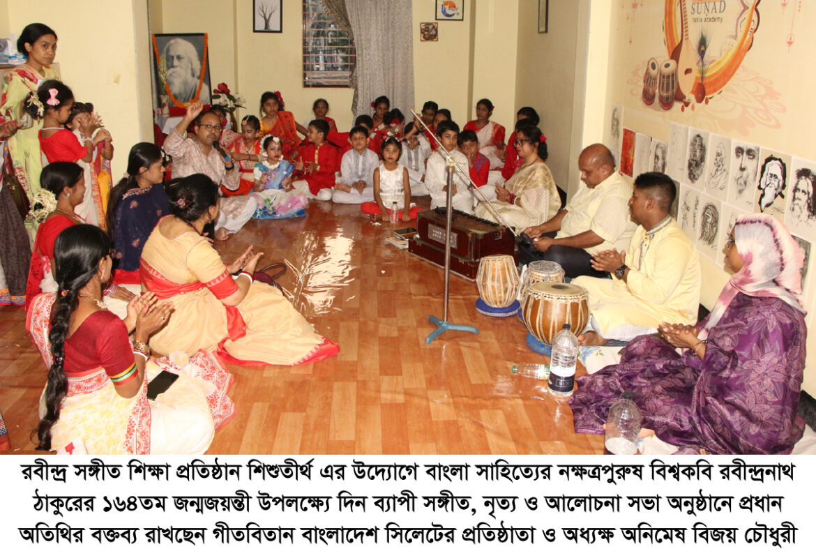 গীতবিতান বাংলাদেশ সিলেটের প্রতিষ্ঠাতা ও অধ্যক্ষ অনিমেষ বিজয় চৌধুরী বলেছেন, বিশ্বকপি রবীন্দ্রনাথ ঠাকুর শুধু বাংলা সাহিত্যের এক অমর কবি নন, তিনি ছিলেন এক বিশ্বজনীন মানবতাবাদী চিন্তক, যাঁর রচনার পরিধি সাহিত্যের সব শাখাকে ছুঁয়ে গেছে। রবীন্দ্রনাথ এমন এক বিস্ময়কর প্রতিভা, যিনি একাধারে কবি, গীতিকার, সুরকার, নাট্যকার, চিত্রশিল্পী এবং দার্শনিক ছিলেন। তাঁর চেতনার আলো আজও আমাদের পথ দেখায়। তিনি আরো বলেন, আমরা চাই আমাদের শিশু-কিশোররা ছোটবেলা থেকেই রবীন্দ্রনাথকে জানুক, বুঝুক এবং ভালোবাসুক। তাঁর সৃষ্টির সঙ্গে পরিচিত হলে তারা সৌন্দর্যবোধ, মানবিকতা এবং নৈতিকতার সঠিক শিক্ষা লাভ করতে পারবে। শিশুতীর্থ সবসময় সে চেষ্টাই করে আসছে। শিশুতীর্থ এরকম আয়োজনের মাধ্যমে নতুন প্রজন্মকে রবীন্দ্রনাথের আদর্শে অনুপ্রাণিত করছে, যা প্রশংসনীয়। এই প্রতিষ্ঠান থেকে শিশু-কিশোরা সঙ্গীত পরিচর্যা করে তাদের মেধাকে সমৃদ্ধ করছে।