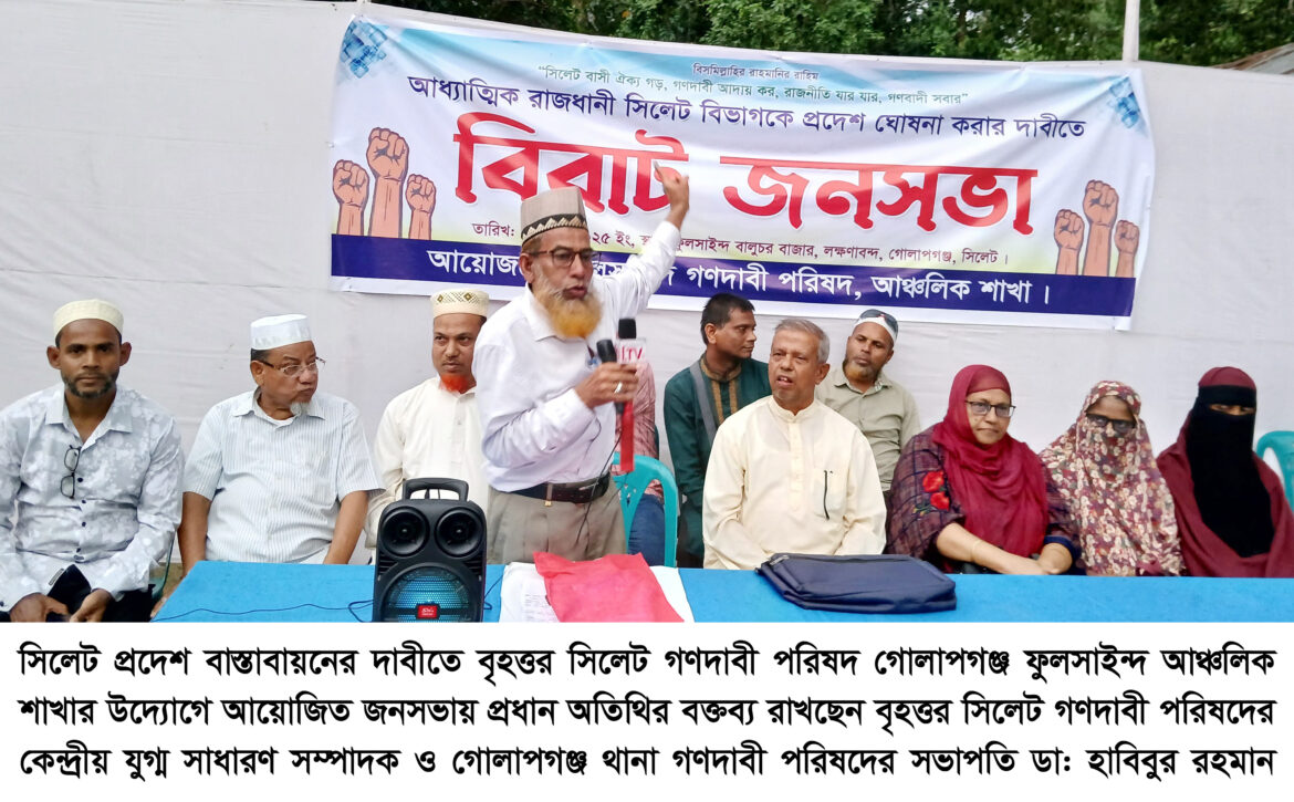 সিলেট প্রদেশ বাস্তবায়নের দাবীতে বৃহত্তর সিলেট গণদাবী পরিষদ গোলাপগঞ্জ উপজেলার ফুলসাইন্দ আঞ্চলিক শাখার উদ্যোগে এক জনসভা অনুষ্ঠিত হয়েছে।