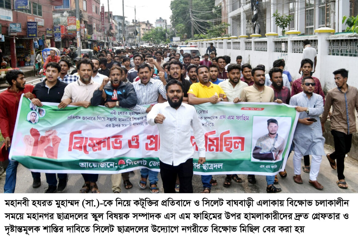 মহানবী হযরত মুহাম্মদ (সা.)-কে নিয়ে কটূক্তির প্রতিবাদে ও সিলেট বাঘবাড়ী এলাকায় বিক্ষোভ চলাকালীন সময়ে মহানগর ছাত্রদলের স্কুল বিষয়ক সম্পাদক এস এম ফাহিমের উপর হামলাকারীদের দ্রুত গ্রেফতার ও দৃষ্টান্তমূলক শাস্তির দাবিতে সিলেট ছাত্রদলের উদ্যোগে বিক্ষোভ মিছিল বের করা হয়।