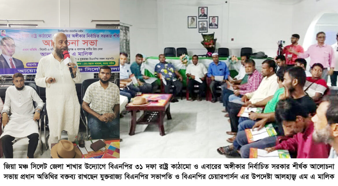 জিয়া মঞ্চ সিলেট জেলার উদ্যোগে রাষ্ট্র কাঠামো ও নির্বাচিত সরকার শীর্ষক সভাতারেক রহমানের ৩১ দফা বাস্তবায়নহলে দেশের জনগণ উপকৃত হবেন——আলহাজ্ব এম এ মালিক