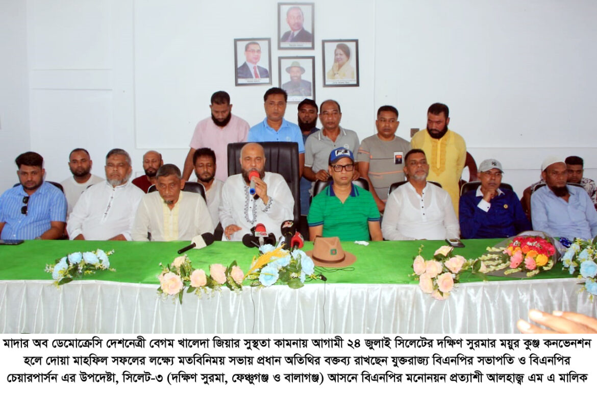 যুক্তরাজ্য বিএনপির সভাপতি ও বিএনপির চেয়ারপার্সন এর উপদেষ্টা, সিলেট-৩ (দক্ষিণ সুরমা, ফেঞ্চুগঞ্জ ও বালাগঞ্জ) আসনে বিএনপির মনোনয়ন প্রত্যাশী আলহাজ্ব এম এ মালিক বলেছেন, মাদার অব ডেমোক্রেসি দেশনেত্রী বেগম খালেদা জিয়ার সুস্থতা কামনায় আগামী ২৪ জুলাই সিলেটের দক্ষিণ সুরমার ময়ুর কুঞ্জ কনভেনশন হলে দোয়া মাহফিলের আয়োজন করা হয়েছে। এতে দক্ষিণ সুরমা, ফেঞ্চুগঞ্জ ও বালাগঞ্জ উপজেলা বিএনপি ও অঙ্গ সহযোগী সংগঠনের নেতাকর্মীসহ দলমত নির্বিশেষে সবাইকে উপস্থিত থাকার আহ্বান জানাচ্ছি। তিনি বলেন, দলের ভারপ্রাপ্ত চেয়ারম্যান তারেক রহমান রাষ্ট্র সংস্কারের জন্য যে ৩১ দফা ঘোষণা করেছেন, তা নিয়ে কেন্দ্রীয় নেতৃবৃন্দ এই দোয়া মাহফিলের পর আলোচনা করবেন। এম এ মালিক বলেন, এর আগেও গোপালগঞ্জের পুলিশ, সচিব এবং প্রশাসন এমন আচরণ করেছে যেন বাংলাদেশ ভারতের অংশ। ভারতের গোয়েন্দা সংস্থা ‘র’ এর প্রত্যক্ষ সহযোগিতায় তারা বাংলাদেশের মানচিত্রের বাইরে গিয়ে চিন্তা করে। অথচ বাংলাদেশের সংবিধান অনুযায়ী যে কোনো রাজনৈতিক দলের অধিকার আছে দেশের যে কোনো স্থানে সভা-সমাবেশ করার। কিন্তু গোপালগঞ্জে এনসিপির রাজনৈতিক সমাবেশে হামলা চালানো হয়েছে, যা অত্যন্ত নিন্দনীয়। এমনকি সাংবাদিকরাও যে কোনো স্থানে নিরপেক্ষ সংবাদ প্রকাশের জন্য যেতে পারেন, সেখানেও তারা বাধার মুখে পড়েন। স্বৈরাচারী শেখ হাসিনা সরকারের সমালোচনা করে এম এ মালিক বলেন, তারা ইতিমধ্যে ৬২ বিলিয়ন ডলার দেশের বাইরে পাচার করেছে। তিনি বলেন, ড. ইউনুসের প্রতি বিএনপির সব ধরনের সহযোগিতা থাকবে। একটি নিরপেক্ষ নির্বাচন হলে দেশে বিএনপির গণজোয়ার সৃষ্টি হবে। বিএনপি হলো সাধারণ মানুষের দল। তবে কিছু উচ্চ বিলাসী নেতা-কর্মী দলের বিরুদ্ধে ষড়যন্ত্র করছে। আমাদেরকে সেই ষড়যন্ত্র মোকাবিলা করতে হবে। তিনি আরও বলেন, এই লক্ষ্য নিয়ে আমরা ইতোমধ্যে গ্রামে গ্রামে কাজ শুরু করেছি। আগামী ২৪ জুলাই ময়ুর কুঞ্জের দোয়া মাহফিল থেকে গোটা সিলেট বিভাগে একটি বার্তা যাবে, আমরা ধানের শীষকে আরও শক্তিশালী করবো। তিনি বলেন, গত ১৫ বছর ধরে তারেক রহমান নিরলসভাবে দেশের মানুষ ও নেতাকর্মীদের ঐক্যবদ্ধ করে ভোটাধিকার ফিরিয়ে দিতে আন্দোলন গড়ে তুলেছেন। সেই আন্দোলনও সফলতার পথে রয়েছে।