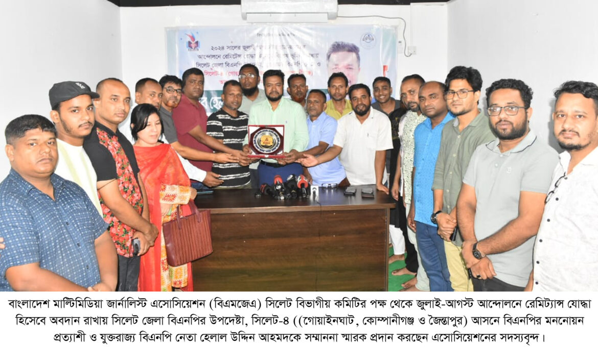 বাংলাদেশ মাল্টিমিডিয়া জার্নালিস্ট এসোসিয়েশন (বিএমজেএ) সিলেট বিভাগীয় কমিটির পক্ষ থেকে জুলাই-আগস্ট আন্দোলনে রেমিট্যান্স যোদ্ধা হিসেবে অবদান রাখায় সিলেট জেলা বিএনপির উপদেষ্টা, সিলেট-৪ ((গোয়াইনঘাট, কোম্পানীগঞ্জ ও জৈন্তাপুর) আসনে বিএনপির মননোয়ন প্রত্যাশী ও যুক্তরাজ্য বিএনপি নেতা হেলাল উদ্দিন আহমদকে সম্মাননা স্মারক প্রদান করছেন এসোসিয়েশনের সদস্যবৃন্দ।