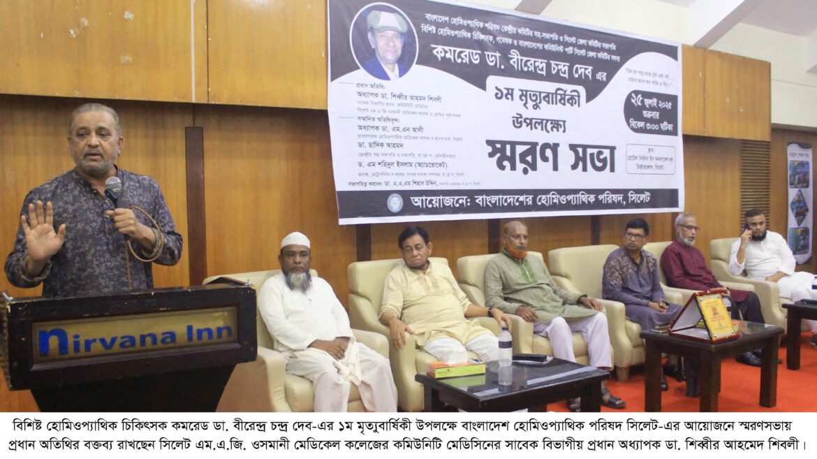 শুক্রবার (২৫ জুলাই ) বিকেল ৩টায় নগরীর মির্জাজাঙ্গালস্থ একটি অভিজাত হোটেল বাহোপ সিলেটের উদ্যোগে বিশিষ্ট হোমিওপ্যাথিক চিকিৎসক, সমাজ সেবক,রাজনৈতিক ব্যক্তিত্ব, বাংলাদেশ হোমিওপ্যাথিক পরিষদ(বাহোপ) সিলেটের সভাপতি ও কেন্দ্রীয় কমিটির সহ সভাপতি ডা,বীরেন্দ্র চন্দ্র দেবের স্মরণে পরিষদের সিলেট এর ভারপ্রাপ্ত সভাপতি ডা. এ.এ.এম শিহাব উদ্দিনের সভাপতিতে ১ম মৃত্যুবার্ষিকী উপলক্ষে স্মরণ সভায় প্রধান অতিথির বক্তব্যে তিনি এসব কথা বলেন ।