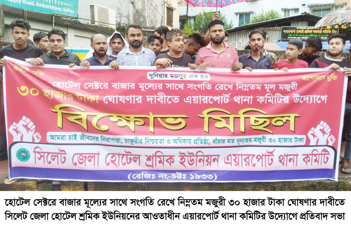 রবিবার (২৭ জুলাই) বিকেল ৫টায় হোটেল সেক্টরে বাজার মূল্যের সাথে সংগতি রেখে নিম্নতম মজুরী ৩০ হাজার টাকা ঘোষণার দাবীতে আম্বরখানা এলাকা থেকে এক বিক্ষোভ মিছিল বের করা হয়। বিক্ষোভ মিছিলটি নগরীর বিভিন্ন সড়ক প্রদক্ষিণ করে আম্বরখানা বড়বাজার গলির সামনে গিয়ে সভা অনুষ্ঠিত হয়।