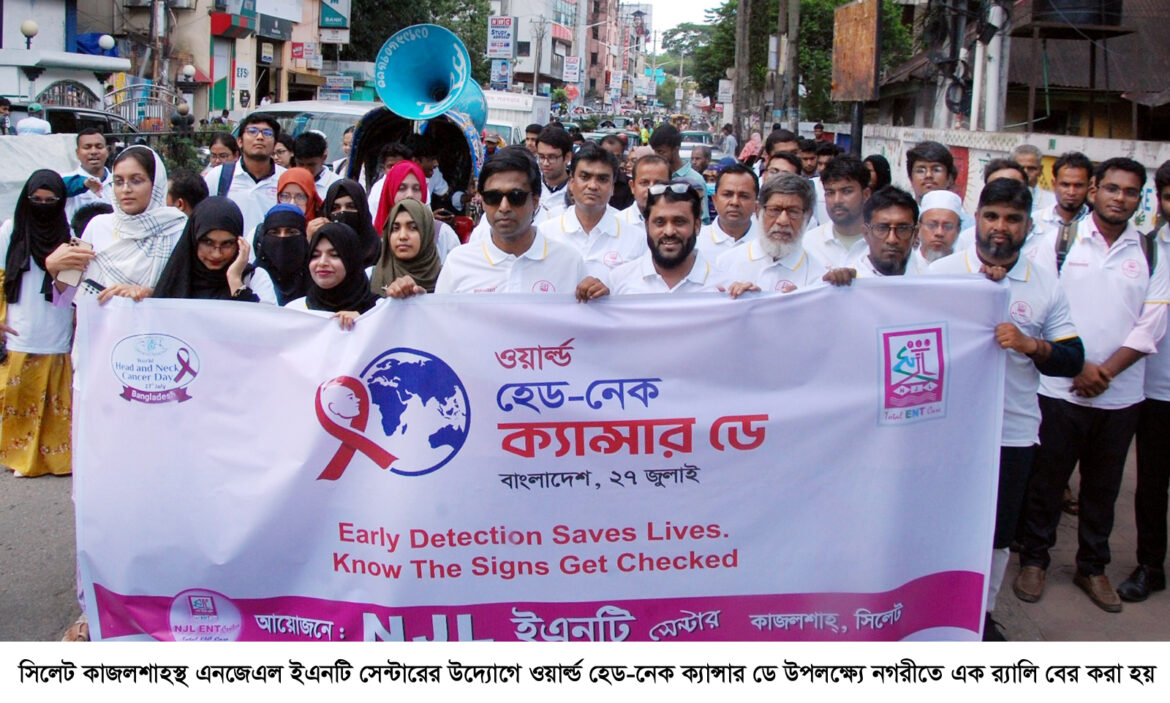 সিলেট কাজলশাহস্থ এনজেএল ইএনটি সেন্টারের উদ্যোগে ওয়ার্ল্ড হেড-নেক ক্যান্সার ডে উপলক্ষ্যে নগরীতে এক র‌্যালি বের করা হয়