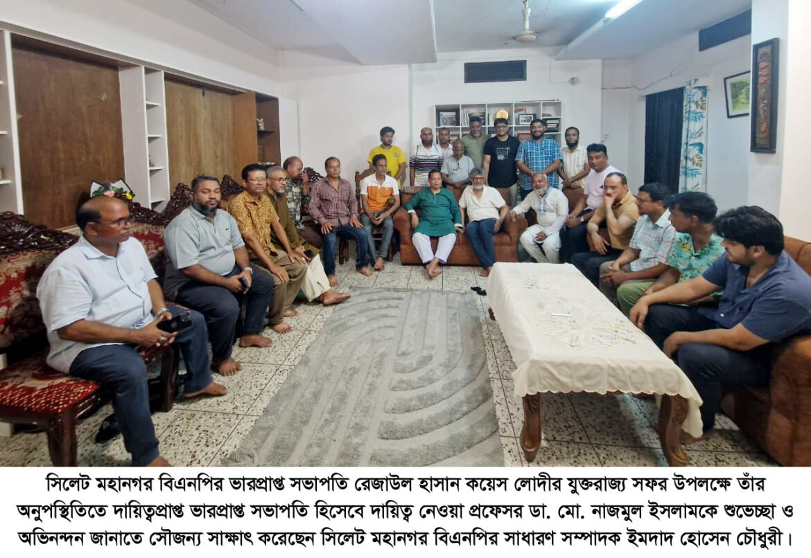সিলেট মহানগর বিএনপির ভারপ্রাপ্ত সভাপতি রেজাউল হাসান কয়েস লোদীর যুক্তরাজ্য সফর উপলক্ষে তাঁর অনুপস্থিতিতে দায়িত্বপ্রাপ্ত ভারপ্রাপ্ত সভাপতি হিসেবে দায়িত্ব নেওয়া প্রফেসর ডা. মো. নাজমুল ইসলামকে শুভেচ্ছা ও অভিনন্দন জানাতে সৌজন্য সাক্ষাৎ করেছেন সিলেট মহানগর বিএনপির সাধারণ সম্পাদক ইমদাদ হোসেন চৌধুরী। বৃহস্পতিবার (৩১ জুলাই) নগরীর বাসভবনে এ সৌজন্য সাক্ষাৎ অনুষ্ঠিত হয়। সাক্ষাৎকালে উভয় নেতার মধ্যে সমসাময়িক রাজনৈতিক পরিস্থিতি, সাংগঠনিক কাঠামো শক্তিশালীকরণ এবং চলমান আন্দোলনের বিষয়ে আলোচনা হয়।