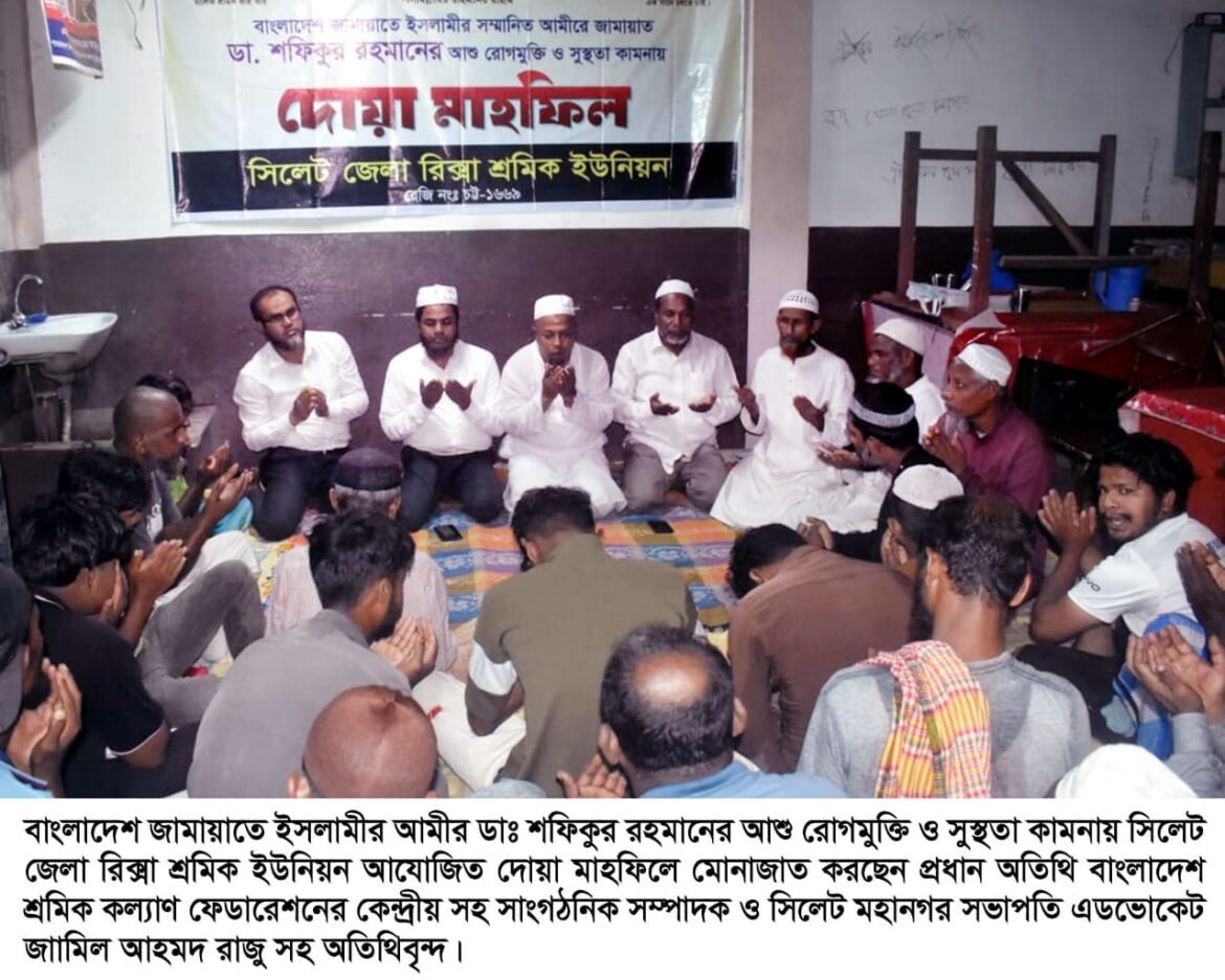 বাংলাদেশ জামায়াতে ইসলামীর আমীর ডাঃ শফিকুর রহমানের আশু রোগমুক্তি ও সুস্থতা কামনায় সিলেট জেলা রিক্সা শ্রমিক ইউনিয়ন রেজিঃ চট্ট ১৬৬৯ এর উদ্যোগে এক দোয়া মাহফিল অনুষ্ঠিত হয়।