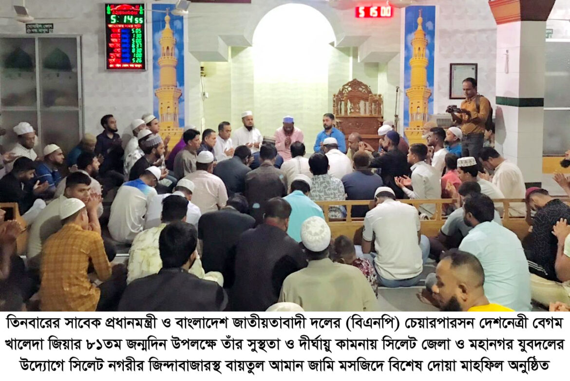 এ উপলক্ষে তাঁর সুস্থতা ও দীর্ঘায়ু কামনায় সিলেট জেলা ও মহানগর যুবদলের উদ্যোগে সিলেট নগরীর জিন্দাবাজারস্থ বায়তুল আমান জামি মসজিদে বিশেষ দোয়া মাহফিল অনুষ্ঠিত হয়।