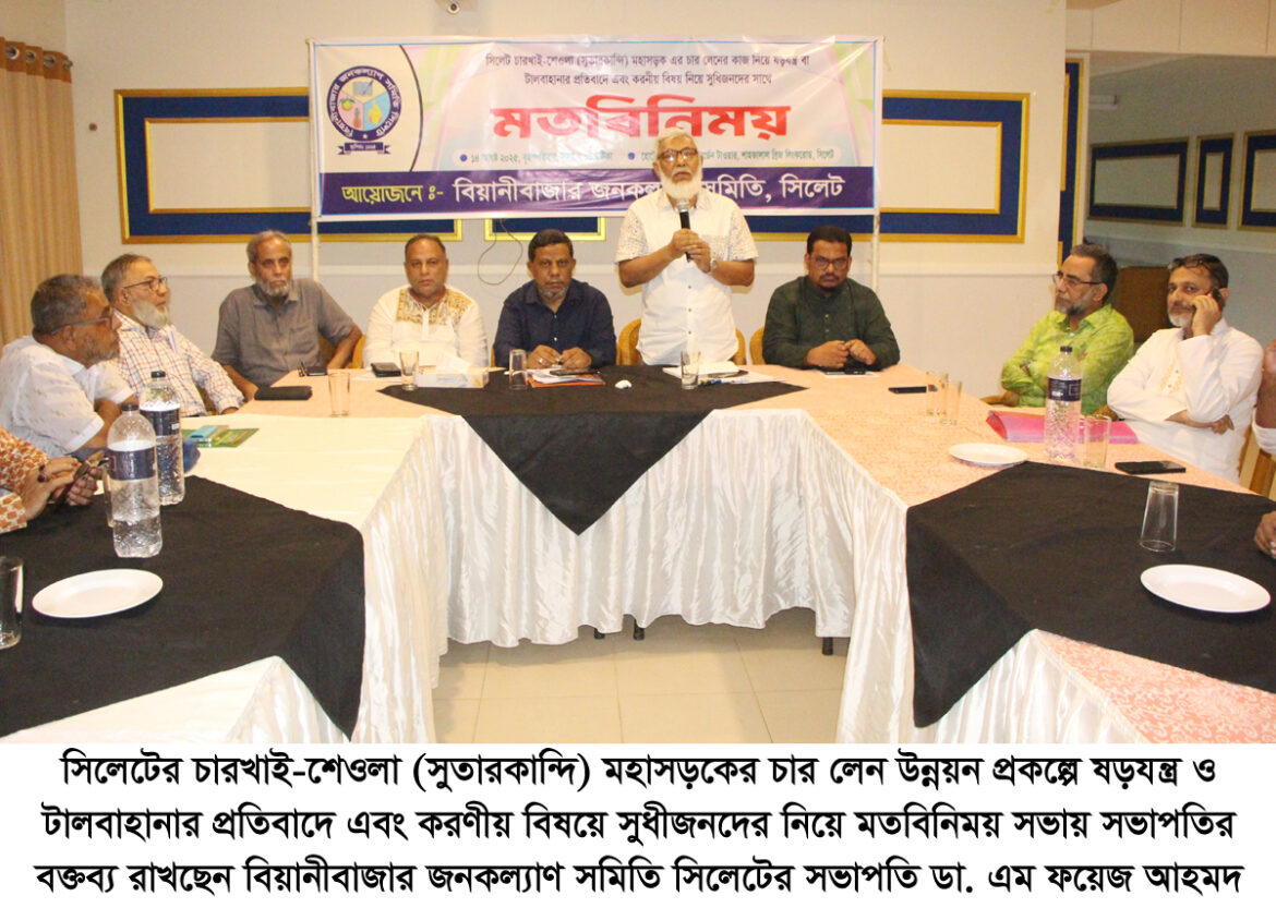 সুধীজনদের সাথে মতবিনিময় সভায় সভাপতির বক্তব্যে বিয়ানীবাজার জনকল্যাণ সমিতি সিলেটের সভাপতি ডা. এম ফয়েজ আহমদ বলেন, উপজেলার সুরমা-কুশিয়ারা নদীযুগল একসময় নৌপরিবহনে গুরুত্বপূর্ণ অবদান রাখলেও বর্তমান দ্রুতগতির যুগে নৌপথ অনেকটাই অব্যবহৃত। ফলে সিলেট-চারখাই-শেওলা সড়কটি বিয়ানীবাজার এবং নিকটবর্তী গোলাপগঞ্জ, জকিগঞ্জ ও বড়লেখা উপজেলার অধিবাসীদের বিভাগীয় নগরী সিলেটের সাথে সার্বক্ষণিক যোগাযোগের প্রধান মাধ্যম হিসেবে ব্যবহৃত হয়ে আসছে। এমন প্রেক্ষাপটে ২০২৩ সালের ১১ এপ্রিল অনুষ্ঠিত একনেক সভায় ‘সিলেট-চারখাই-শেওলা মহাসড়ক উন্নয়ন প্রকল্প’ নামে একটি পরিকল্পনা গৃহীত হলে বিয়ানীবাজার ও পার্শ্ববর্তী এলাকার সাধারণ মানুষ নতুন স্বপ্ন দেখতে শুরু করে এবং প্রকল্প বাস্তবায়নের জন্য আগ্রহভরে অপেক্ষা করতে থাকে।