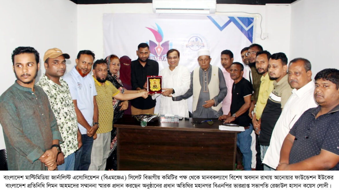 বাংলাদেশ মাল্টিমিডিয়া জার্নালিস্ট এসোসিয়েশন (বিএমজেএ) সিলেট বিভাগীয় কমিটির পক্ষ থেকে মানবকল্যাণে বিশেষ অবদান রাখায় আনোয়ার ফাউন্ডেশন ইউকের বাংলাদেশ প্রতিনিধি লিমন আহমদের সম্মাননা স্মারক প্রদান করছেন অনুষ্ঠানের প্রধান অতিথির মহানগর বিএনপির ভারপ্রাপ্ত সভাপতি রেজাউল হাসান কয়েস লোদী।