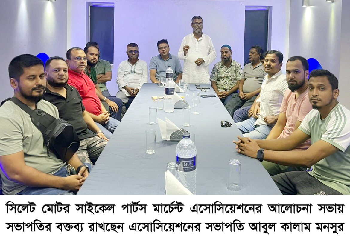 সিলেট মোটর সাইকেল পার্টস মার্চেন্ট এসোসিয়েশনের সভাপতি আবুল কালাম মনসুর এর সভাপতিত্বে ও সাধারণ সম্পাদক সাজুওয়ান আহমদ এর পরিচালনায় সভায় বক্তব্য রাখেন ও উপস্থিত ছিলেন এসোসিয়েশনের সহ সভাপতি আব্দুল্লাহ জিয়া, মো. আতাহার আলী, সাংগঠনিক সম্পাদক মো. ইমতিয়াজ আহমদ, অর্থ সম্পাদক মো. কামরান হোসেন, দপ্তর সম্পাদক জুনেদুর রহমান, ক্রীড়া সম্পাদক নুরুল আমিন, সমাজসেবা সম্পাদক রায়হান আহমদ, সদস্য সৈয়দ আতিকুর রহমান, আনহার উদ্দিন, মঞ্জুলাল দাশ, জহরুল ইসলাম, মো. নবিউল ইসলাম।