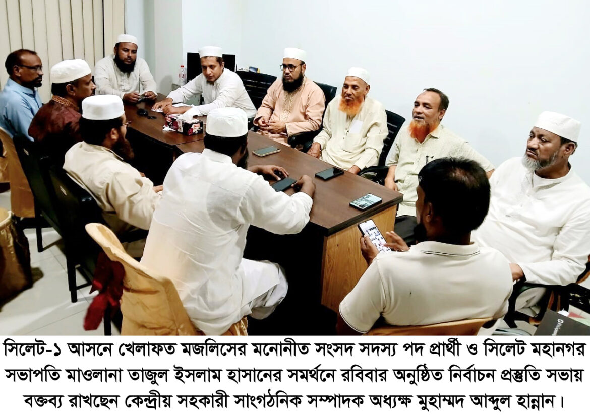 আসন্ন জাতীয় সংসদ নির্বাচনে সিলেট-১ আসনে খেলাফত মজলিস মমনোনীত প্রার্থী ও সিলেট মহানগর সভাপতি মাওলানা তাজুল ইসলাম হাসানের সমর্থনে নির্বাচনী প্রস্তুতি গ্রহণের লক্ষ্যে গঠিত নির্বাচন সমন্বয় কমিটির এক প্রস্তুতি সভা গতকাল ১৭ আগস্ট রবিবার রাত অনুষ্ঠিত হয়। সিলেট মহানগর সহ সভাপতি ও নির্বাচন পরিচালনা কমিটির আহবায়ক মাওলানা শাহ আশিকুর রহমানের সভাপতিত্বে ও সদস্য সচিব হাফিজ মাওলানা জাবেদুল ইসলাম চৌধুরীর পরিচালনায় অনুষ্ঠিত সভায় প্রধান অতিথির বক্তব্য রাখেন সংগঠনের কেন্দ্রীয় সহকারী সাংগঠনিক সম্পাদক অধ্যক্ষ মুহাম্মদ আব্দুল হান্নান। বিশেষ অথিতির বক্তব্য রাখেন