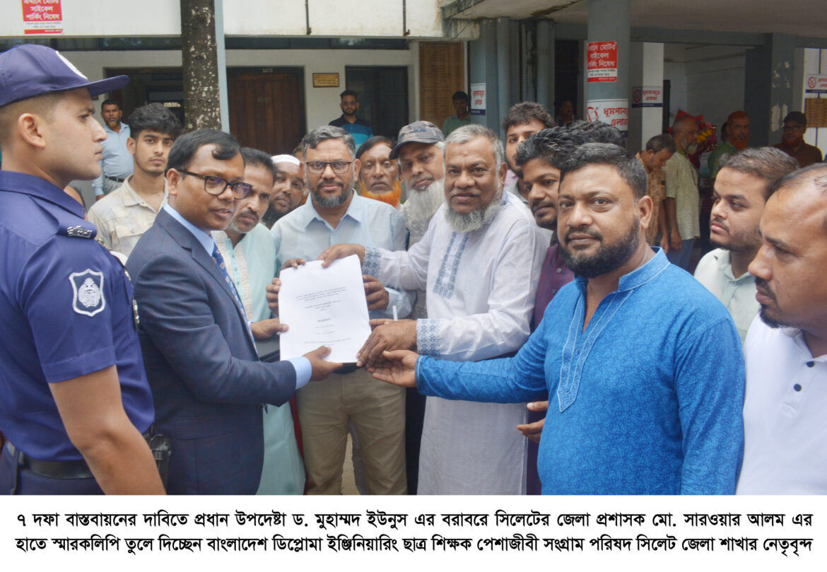 প্রকৌশল ও প্রযুক্তি বিশ্ববিদ্যালয়ের শিক্ষার্থীগণ কর্তৃক প্রকৌশলী অধিকার আন্দোলন এর ব্যানারে ডিপ্লোমা ইঞ্জিনিয়ারিং শিক্ষাক্রম ও ডিপ্লোমা ইঞ্জিনিয়ারদের বিরুদ্ধে অব্যাহত ষড়যন্ত্রের প্রেক্ষিতে ৭ দফা বাস্তবায়নের দাবিতে অন্তর্বর্তীকালীন সরকারের প্রধান উপদেষ্টা ড. মুহাম্মদ ইউনুস এর বরাবরে জেলা প্রশাসকের মাধ্যমে স্মারকলিপি প্রদান করেছেন বাংলাদেশ ডিপ্লোমা ইঞ্জিনিয়ারিং ছাত্র শিক্ষক পেশাজীবী সংগ্রাম পরিষদ সিলেট জেলা শাখা নেতৃবৃন্দ।