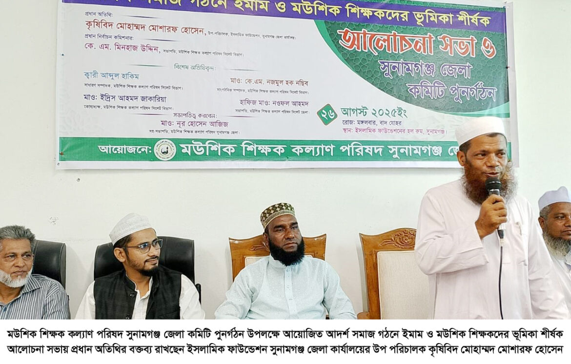 ইসলামিক ফাউন্ডেশন কর্তৃক পরিচালিত মসজিদভিত্তিক শিশু ও গণশিক্ষা কার্যক্রম পরিচালনায় দায়িত্বরত শিক্ষকদের সংগঠন “মউশিক শিক্ষক কল্যাণ পরিষদ” সুনামগঞ্জ জেলা কমিটি পুনর্গঠন উপলক্ষে আদর্শ সমাজ গঠনে ইমাম ও মউশিক শিক্ষকদের ভূমিকা শীর্ষক আলোচনা সভা অনুষ্ঠিত হয়েছে।