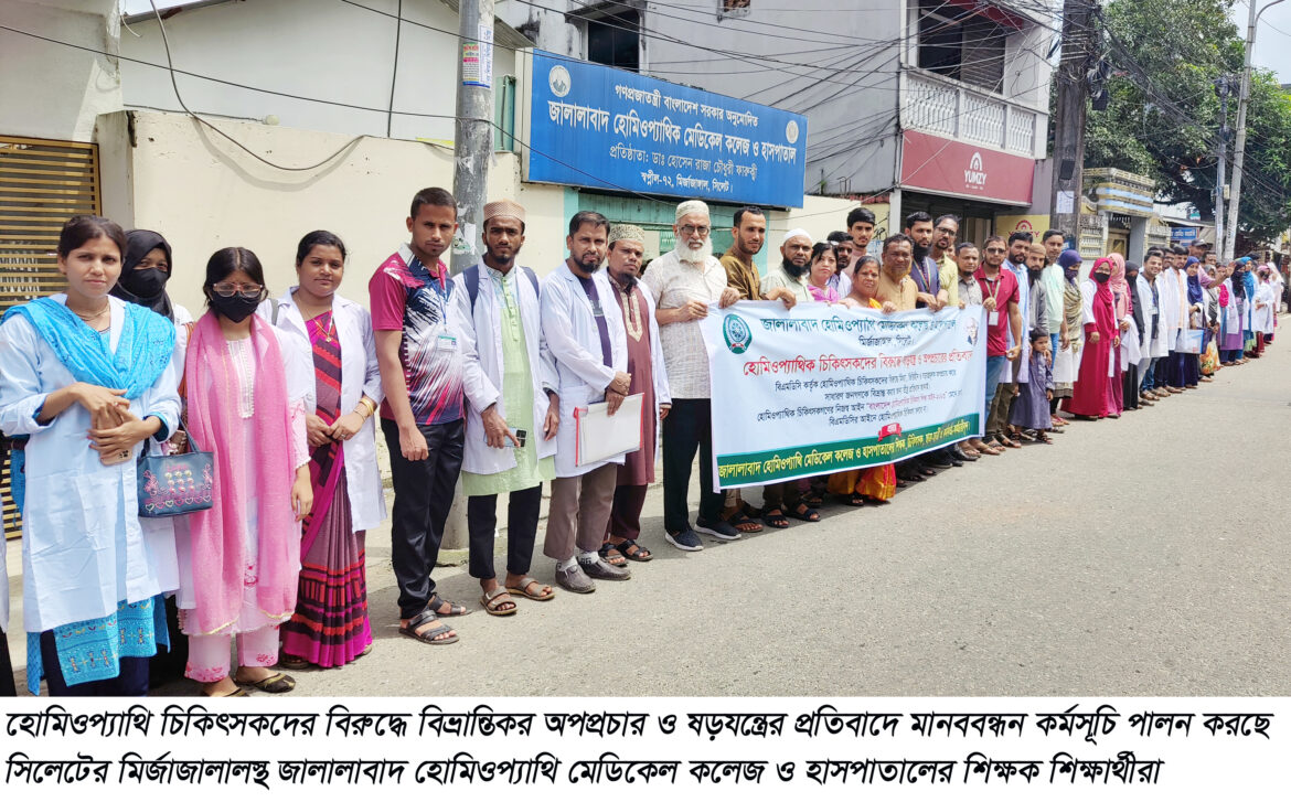হোমিওপ্যাথি চিকিৎসকদের বিরুদ্ধে বিভ্রান্তিকর অপপ্রচার ও ষড়যন্ত্রের প্রতিবাদে মানববন্ধন কর্মসূচি পালন করছে সিলেটের মির্জাজালালস্থ জালালাবাদ হোমিওপ্যাথি মেডিকেল কলেজ ও হাসপাতালের শিক্ষক শিক্ষার্থীরা।