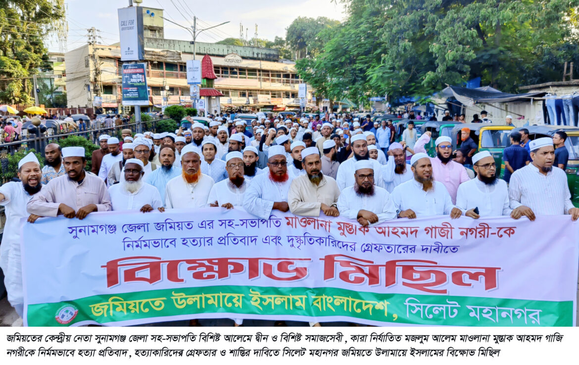 ৫ সেপ্টেম্বর শুক্রবার বাদ আসর সিলেট মহানগর জমিয়ত আয়োজিত বিক্ষোভ মিছিল পরবর্তী সমাবেশে নেতৃবৃন্দ এই দাবি জানান নেতৃবৃন্দ আরো বলেন একজন সহজ সরল সাধারণ জীবন যাপনকারী একজন আলেমকে নির্মমভাবে হত্যা করা হলো আজ তিনদিন হয়ে গেল প্রশাসনের দ্বারস্থ হয়েও পরিবার দল কোন সহযোগিতা পায়নি এটা দুঃখজনক নেতৃবৃন্দ হুঁশিয়ার উচ্চারণ করে বলেন অবিলম্বে দুষ্কৃতিকারীদের গ্রেফতার করে আইনের আওতায় এনে দৃষ্টান্তমূলক শাস্তি দিন অন্যথায় শান্ত সিলেট অশান্ত করার কোন দুর্ভিসন্ধ্যমূলক কোন তৎপরতা জমিয়ত মেনে নেবে না।
