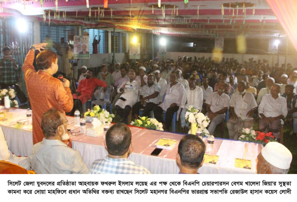 তিনি শুক্রবার রাতে ৪১নং ওয়ার্ডের আব্দুর রশীদ একাডেমির মাঠে সিলেট জেলা যুবদলের প্রতিষ্টাতা আহবায়ক ফখরুল ইসলাম লয়েছ এর উদ্যোগে বিএনপি চেয়ারপারসন বেগম খালেদা জিয়া’র সুস্থতা কামনা করে দোয়া মাহফিলে প্রধান অতিথির বক্তব্যে এই কথাগুলো বলেন।
