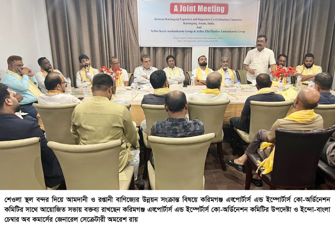 শেওলা স্থল বন্দর দিয়ে আমদানী ও রপ্তানী বাণিজ্যের উন্নয়ন সংক্রান্ত বিষয়ে করিমগঞ্জ এক্সপোর্টার্স এন্ড ইম্পোর্টার্স কো-অর্ডিনেশন কমিটির সাথে সিলেট কয়লা আমদানীকারক গ্রুপ ও সিলেট জেলা পাথর আমদানীকারক গ্রুপের এক যৌথ সভা রবিবার (৭ সেপ্টেম্বর) রাত ৮টায় স্থানীয় একটি হোটেলের হলরুমে অনুষ্ঠিত হয়।