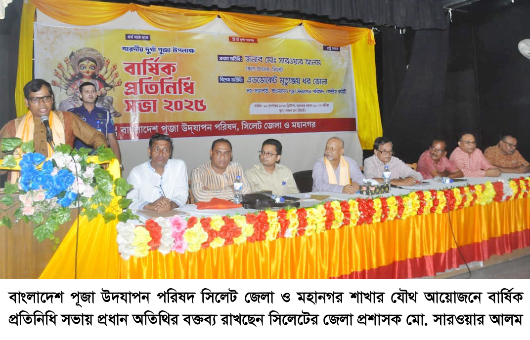 শারদীয় দূর্গাপূজা-১৪৩২ উপলক্ষ্যে শুক্রবার (১২ সেপ্টেম্বর) সকাল ১১টায় শারদা স্মৃতি ভবনে বাংলাদেশ পূজা উদযাপন পরিষদ সিলেট জেলা ও মহানগর শাখার যৌথ আয়োজনে বার্ষিক প্রতিনিধি সভা-২০২৫ এ প্রধান অতিথির বক্তব্যে তিনি উপরোক্ত কথাগুলো বলেন।