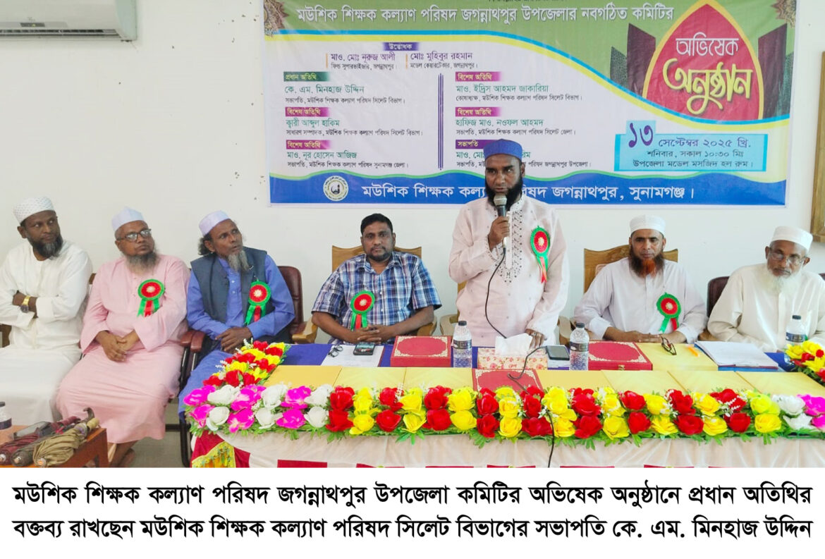 শনিবার (১৩ সেপ্টেম্বর ২০২৫) জগন্নাথপুর উপজেলা মডেল মসজিদ হলরুমে মউশিক শিক্ষক কল্যাণ পরিষদ জগন্নাথপুর উপজেলা সভাপতি মাও. ফজলুল করিম এর সভাপতিত্বে এবং সহ- সভাপতি মাওঃ আশরাফ আলীর সঞ্চালনায় অভিষেক অনুষ্ঠানের উদ্ভোধক হিসেবে উপস্থিত ছিলেন ইসলামিক ফাউন্ডেশন জগন্নাথপুর উপজেলার মডেল কেয়ার টেকার হাফিজ মুহিবুর রহমান।