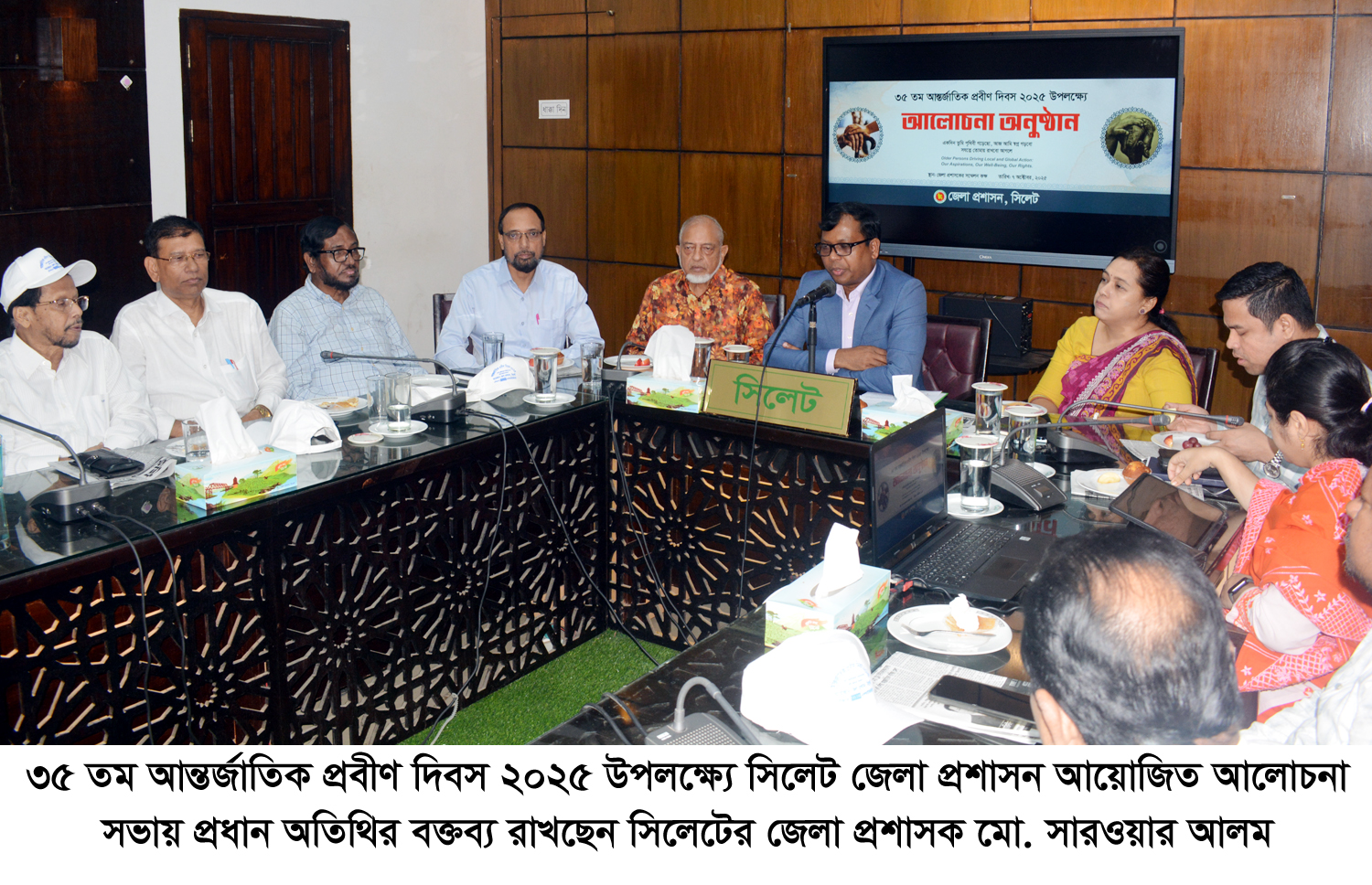 বাংলাদেশ প্রবীণ হিতৈষী সংঘ ও জরাবিজ্ঞান প্রতিষ্ঠান সিলেট জেলা ও বিভাগের সিনিয়র সহ সভাপতি কলামিস্ট, সাংবাদিক চৌধুরীর সভাপতিত্বে ও অতিরিক্ত জেলা প্রশাসক সার্বিক পদ্মাসন সিংহ এর পরিচালনায় আলোচনায় সভায় বিশেষ অতিথির বক্তব্য রাখেন, সিলেট জেলার অতিরিক্ত পুলিশ সুপার মো. রাসেলুর রহমান, সিলেট সদর উপজেলা নির্বাহী অফিসার খুসবু রুবাইয়্যাৎ। শুরুতে স্বাগত বক্তব্য রাখেন, জেলা সমাজ সেবা কার্যালয়ের উপ পরিচালক মো. আব্দুর রফিক।