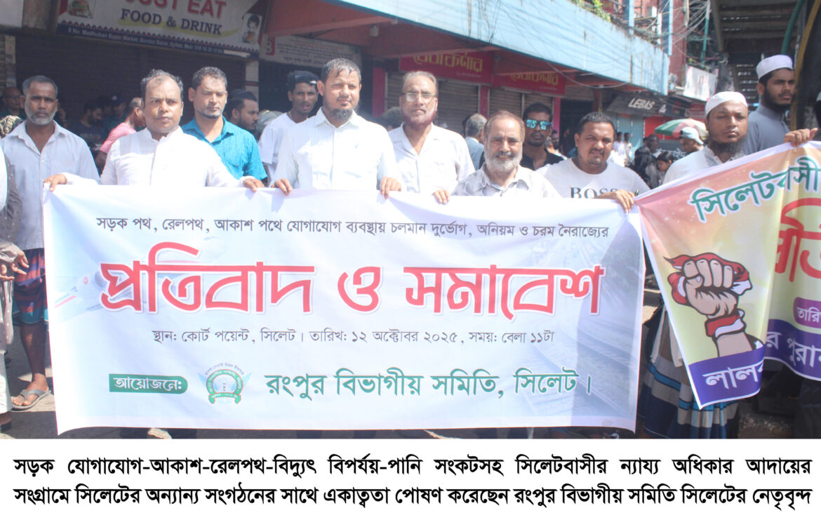 সড়ক যোগাযোগ-আকাশ-রেলপথ-বিদ্যুৎ বিপর্যয়-পানি সংকটসহ সিলেটবাসীর ন্যায্য অধিকার আদায়ের সংগ্রামে সিলেটের অন্যান্য সংগঠনের সাথে একাত্বতা পোষণ করেছেন রংপুর বিভাগীয় সমিতি সিলেটের নেতৃবৃন্দ।