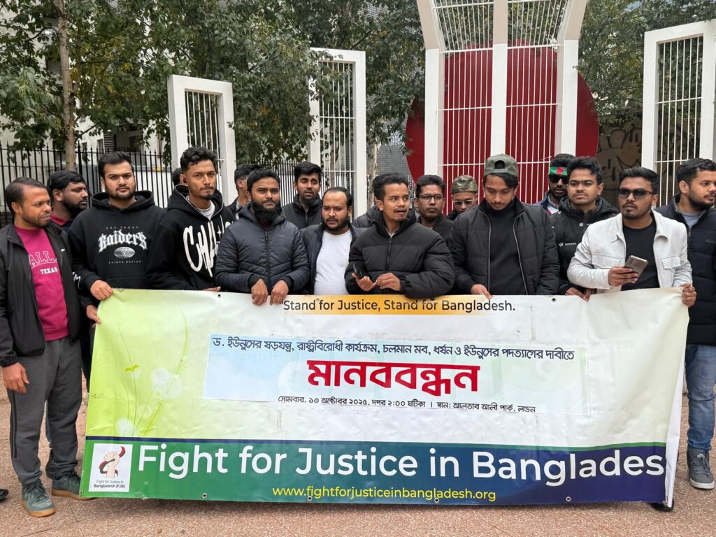 পূর্ব লন্ডনের আলতাব আলী পার্কে মানবাধিকার সংগঠন ফাইট ফর জাস্টিস ইন বাংলাদেশ এর উদ্যোগে ড ইউনুসের পদত্যাগের দাবিতে এক বিশাল মানববন্ধন অনুষ্টিত হয়েছে।